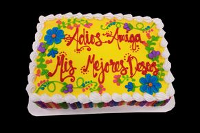 All flavors, all icings, decorations may be multicolored, full flowers such as sunflowers, Gerber daisies or full roses, 3 letter, or monogram etc.